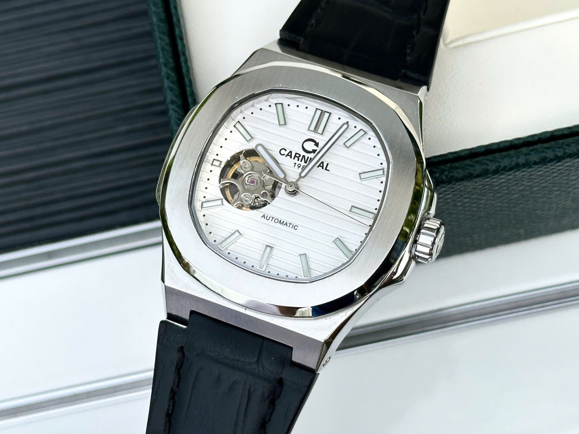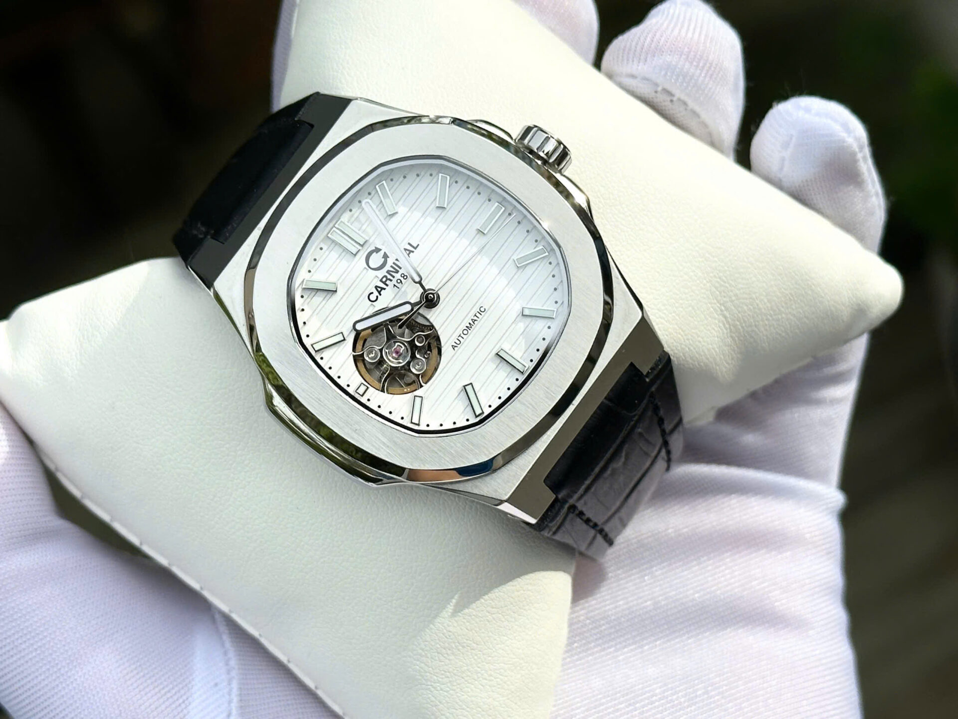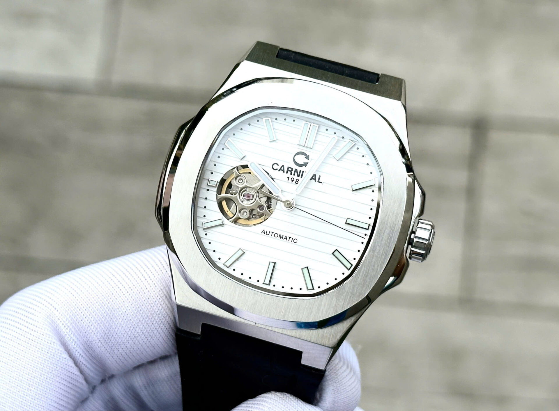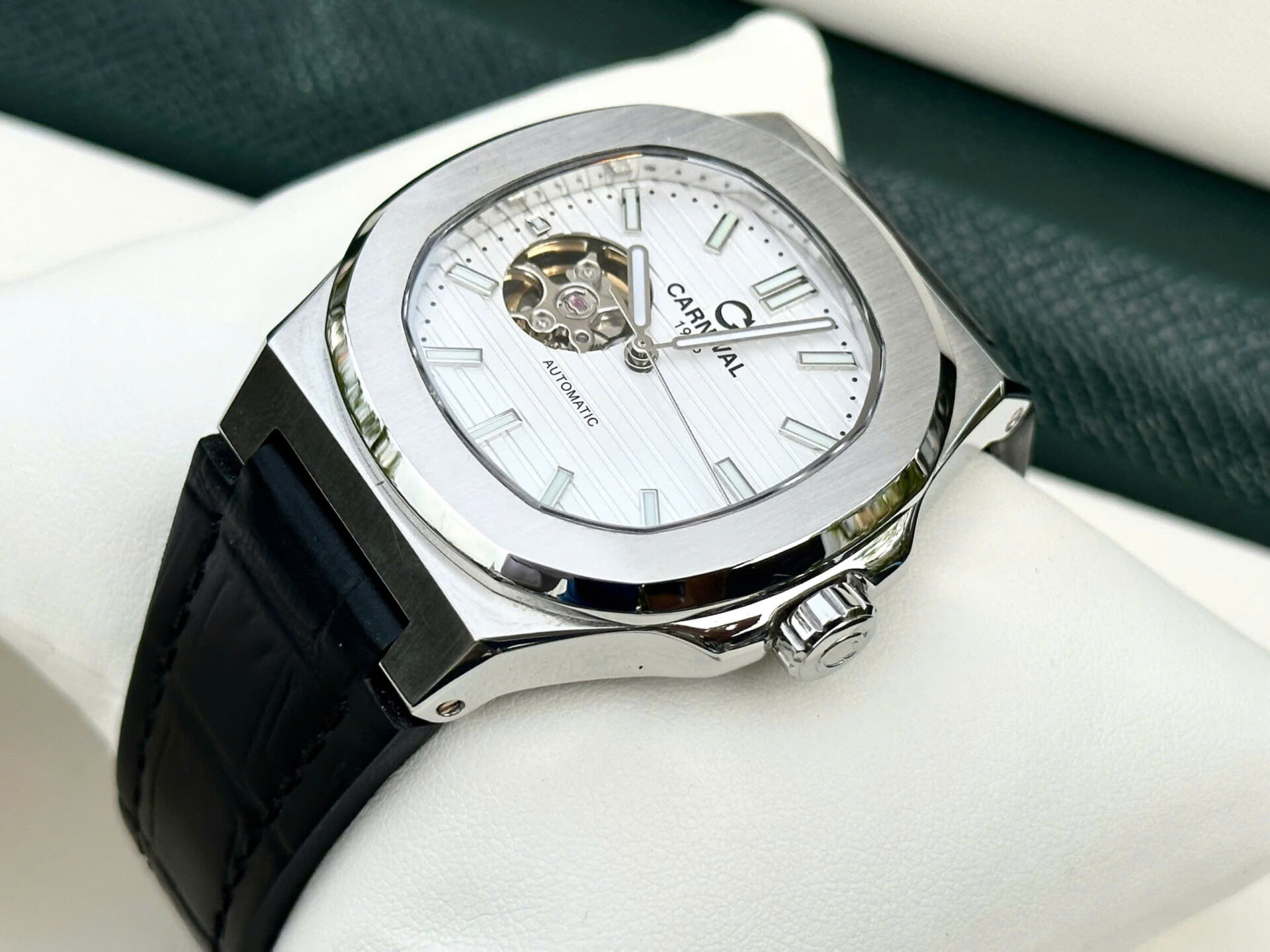 ✨ Carnival 8128G – Mặt dial trắng cực sang trên cổ tay, thiết kế open heart lộ tim đầy cuốn hút.