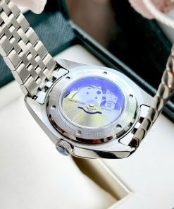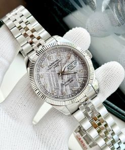 • Mặt số: Vân thiên thạch màu trắng – đính đá Swarovski nổi bật, vành bezel niềng khía phong cách Rô Lếch huyền thoại