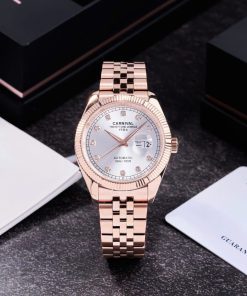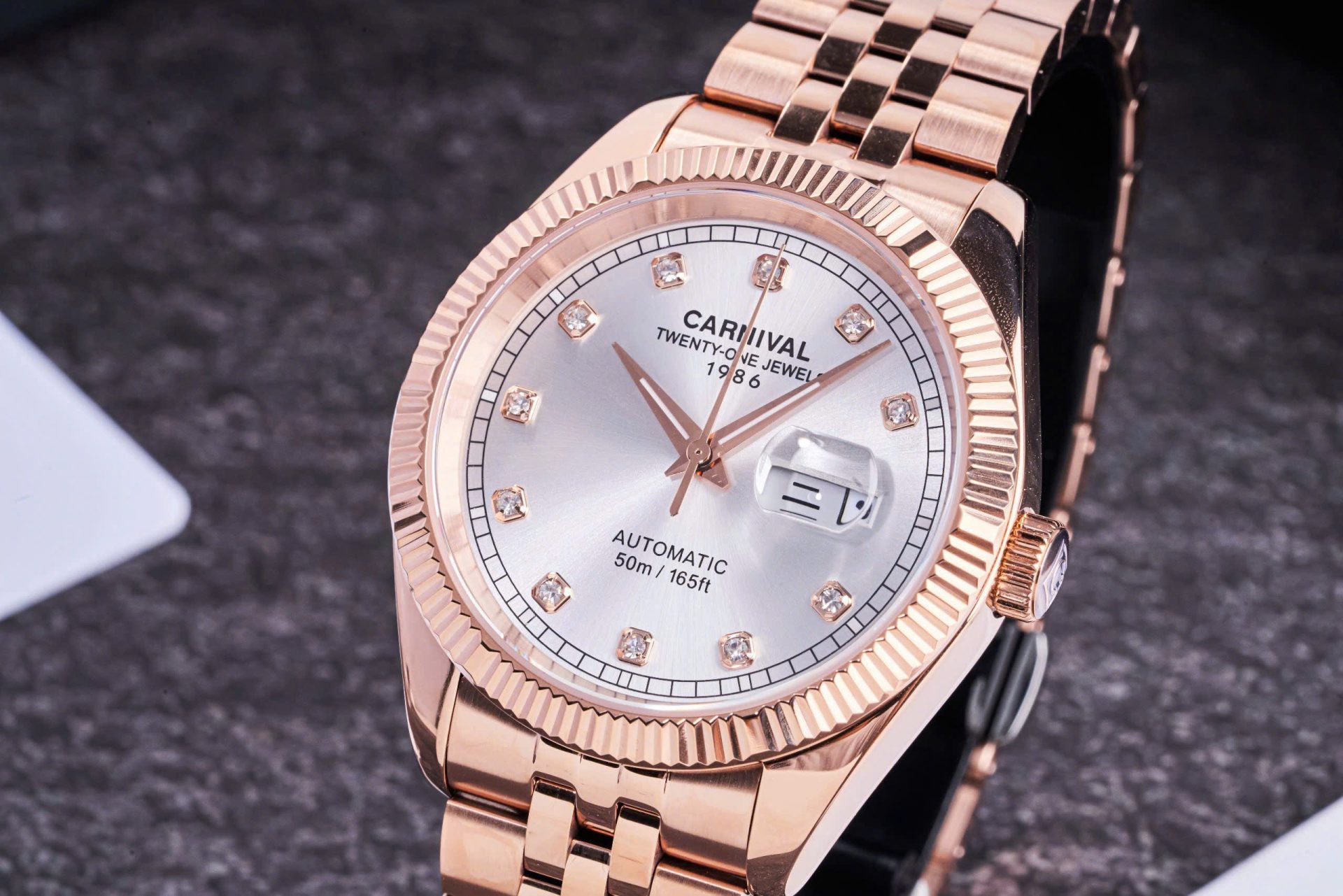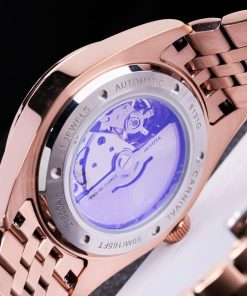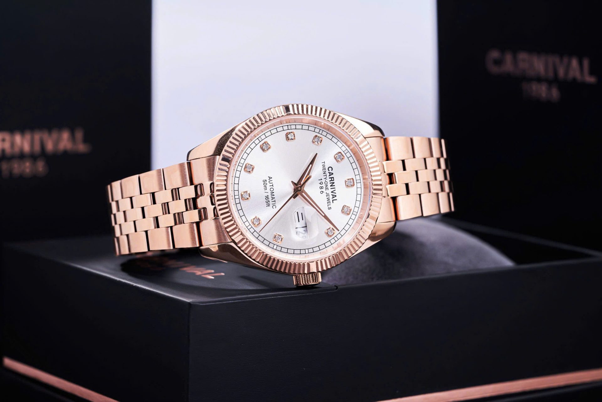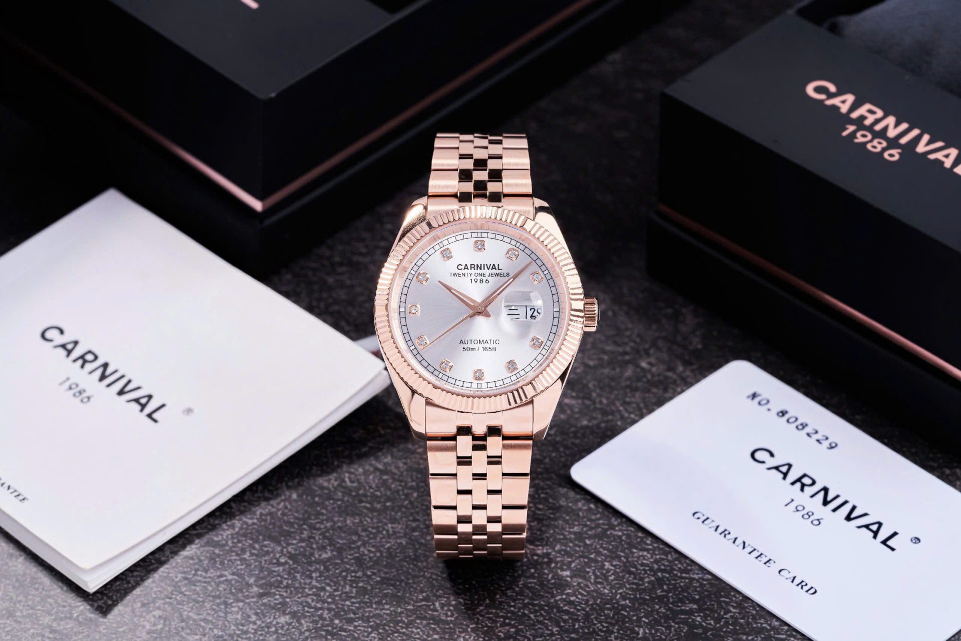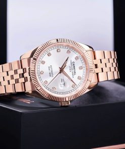 • Thiết kế: Mặt trắng kết hợp viền niềng khía demi rose gold, mặt số gắn đá Swarovski – gợi nhớ dáng dấp Ro.lex Datejust huyền thoại