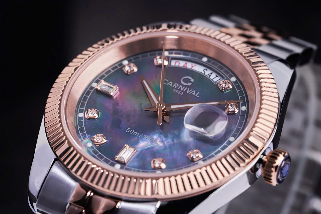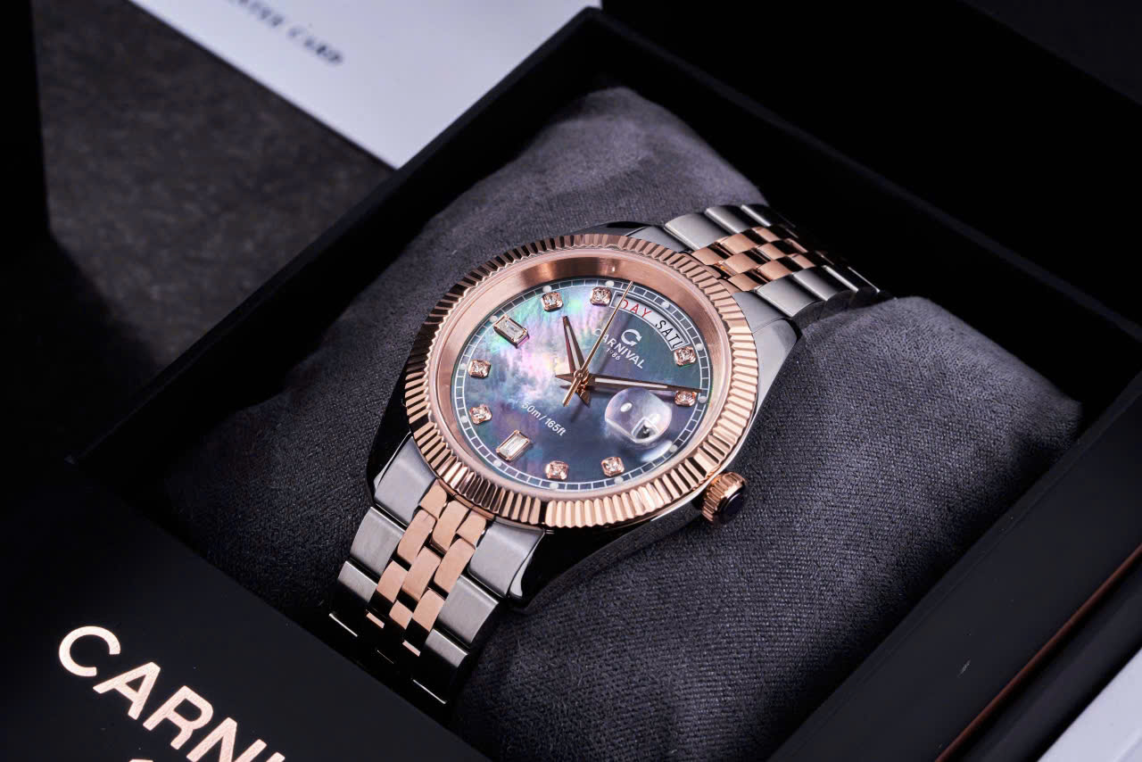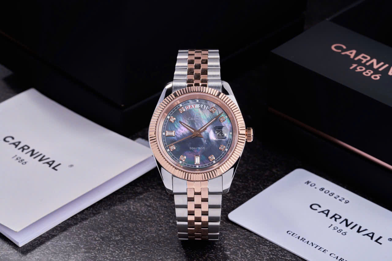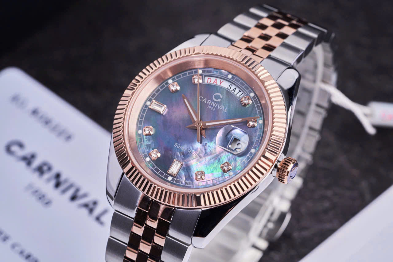• Thiết kế: Mặt dial khảm trai demi rose gold – lấp lánh sang trọng, thu hút ánh nhìn