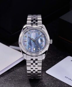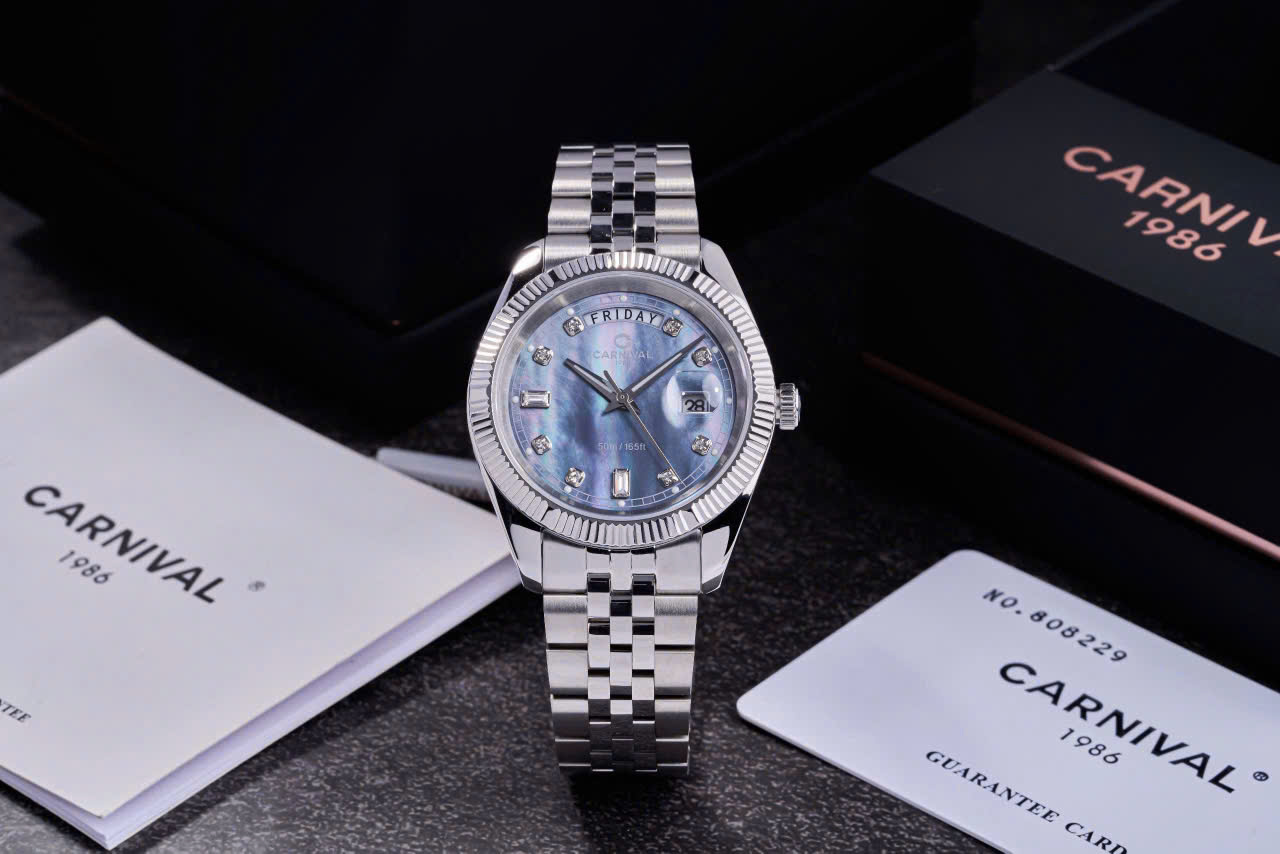 • Thiết kế: Mặt số khảm trai trắng – tinh tế, sáng bừng cổ tay