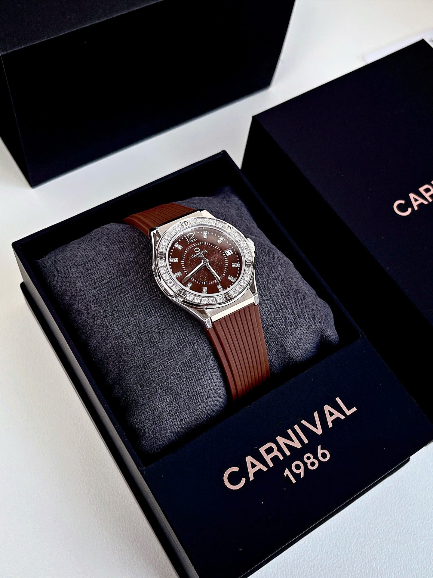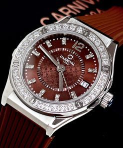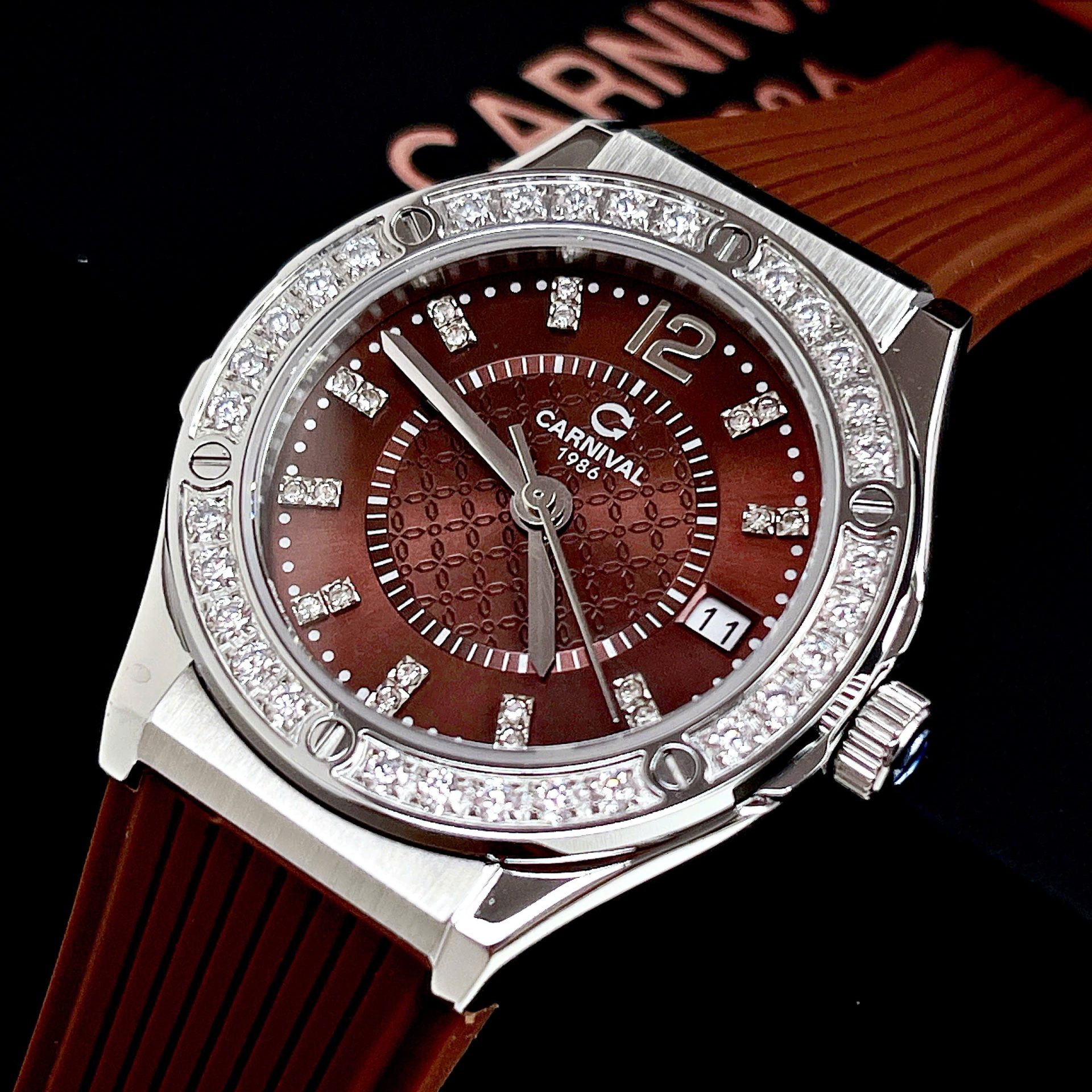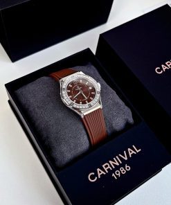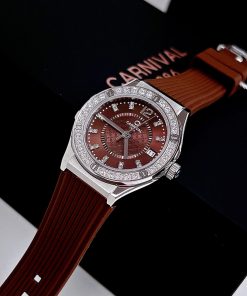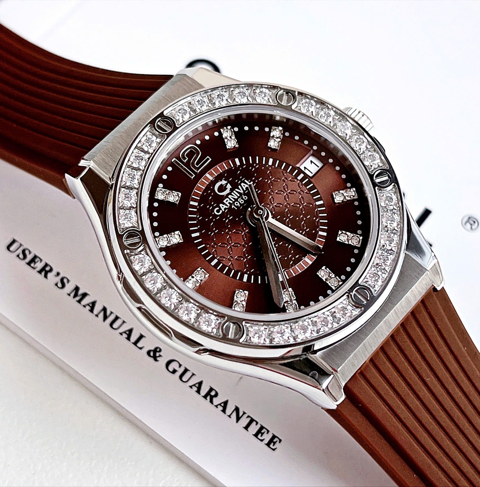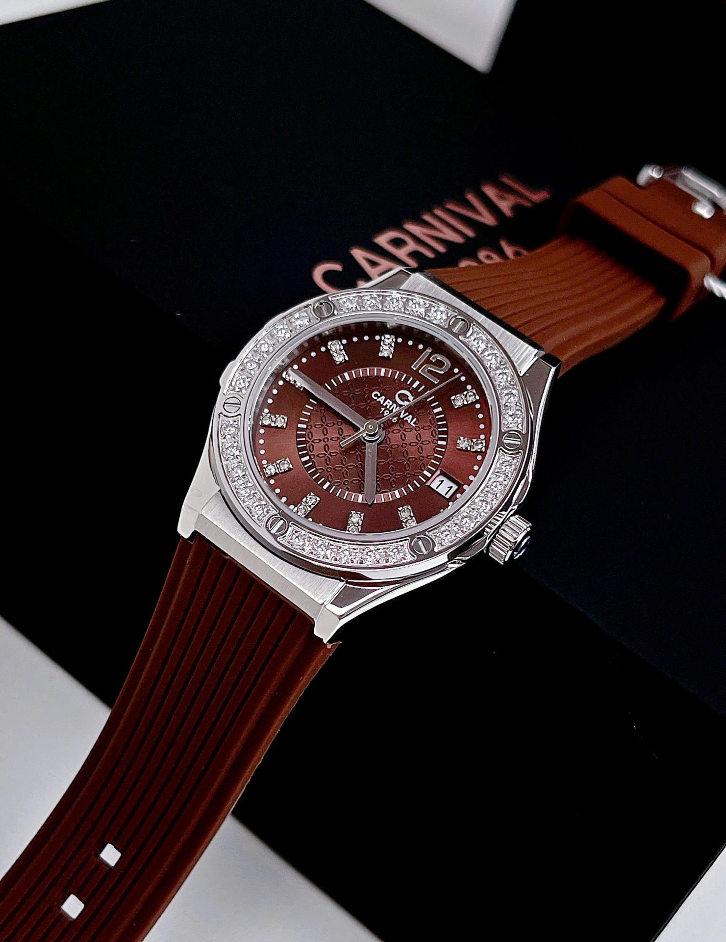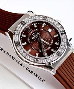 • Mặt số: Nâu – Viền đính full đá sáng bóng, nổi bật, sang trọng