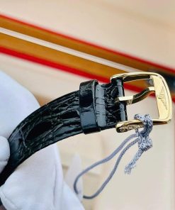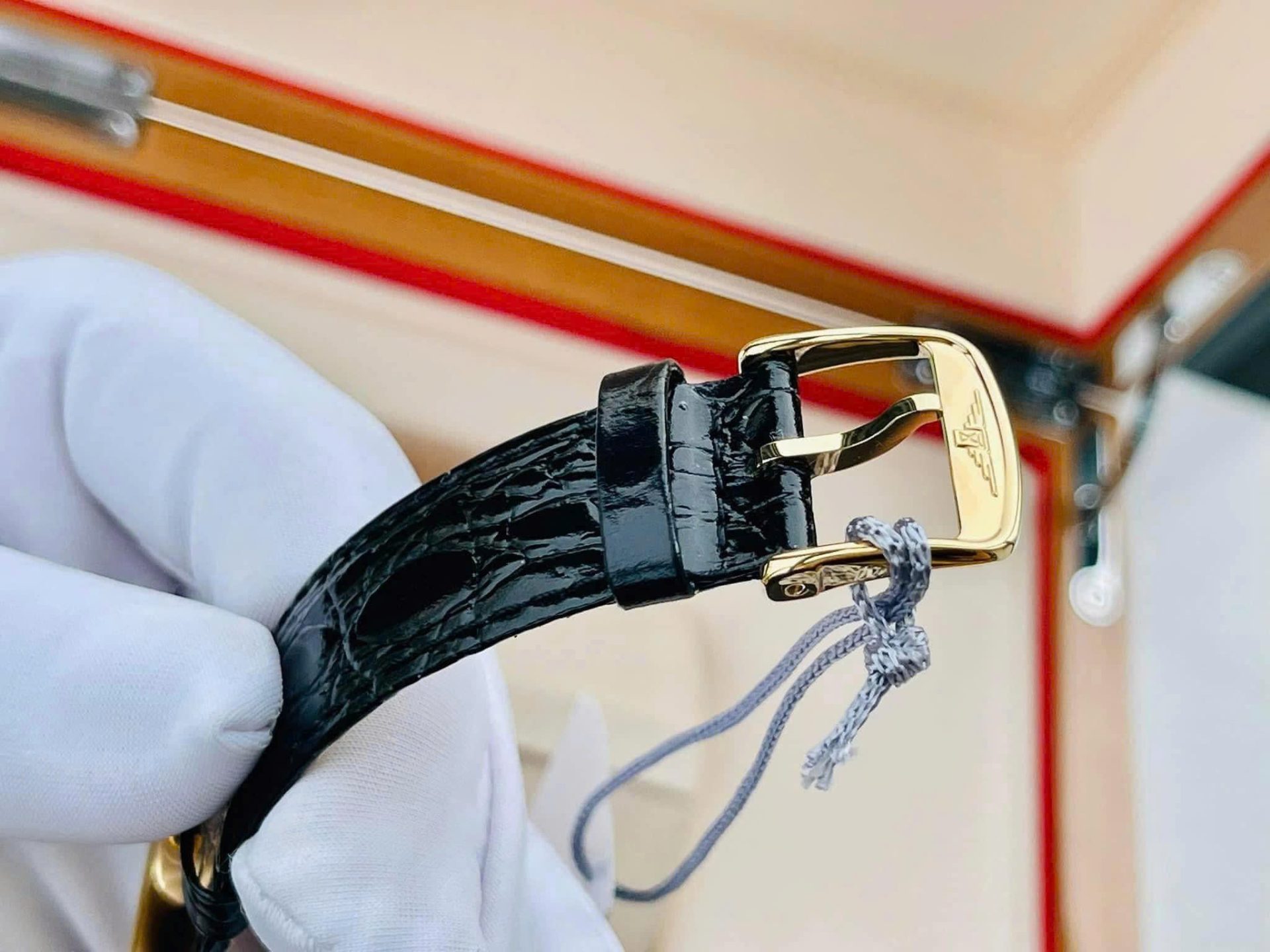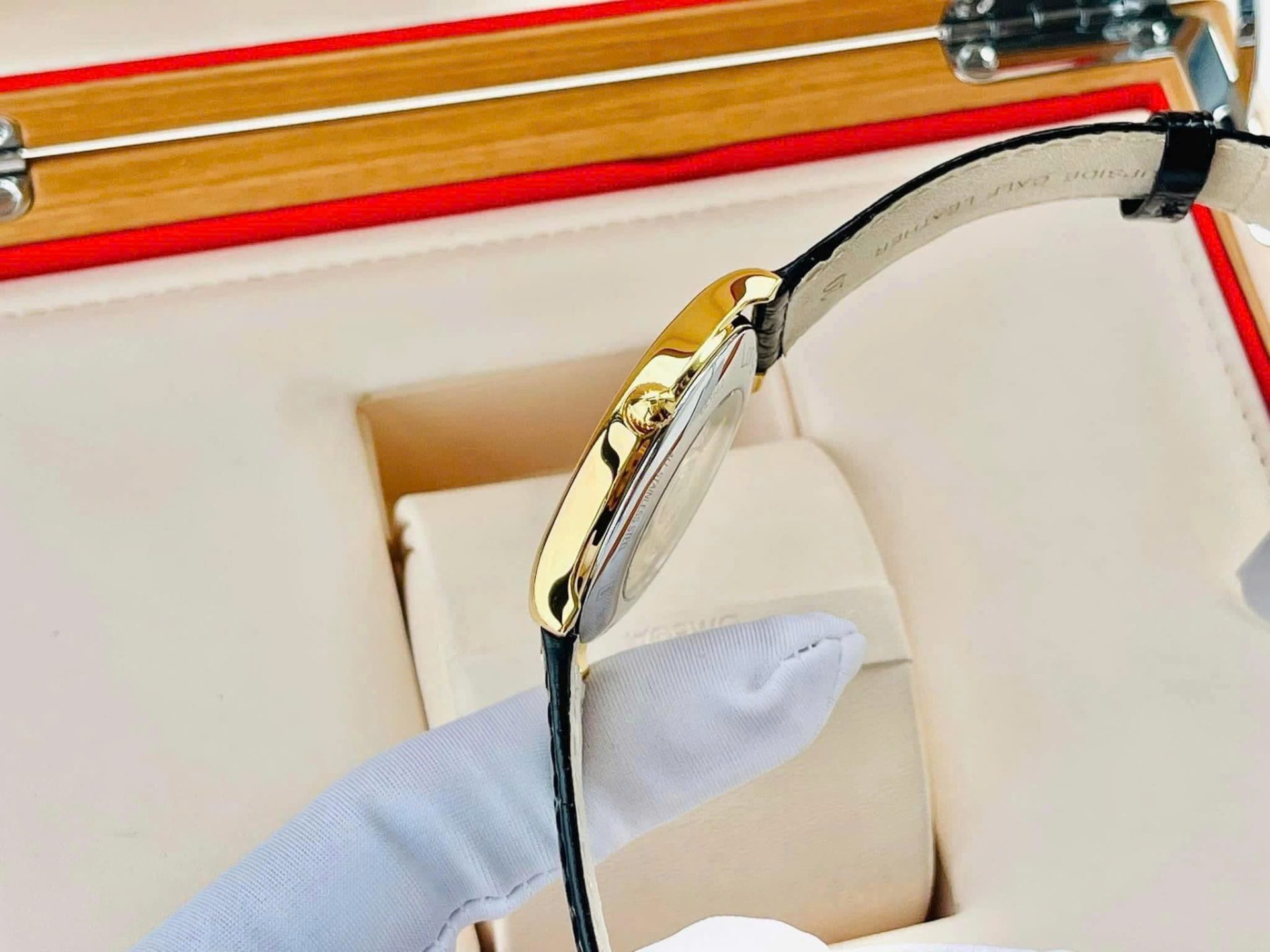 • Dây: Da thật cao cấp, tone vàng đồng điệu với mặt số